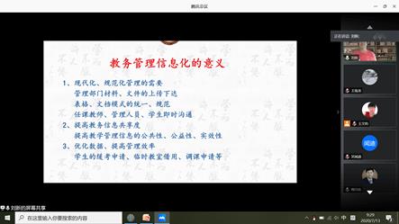 第一阶段会议由副院长王海龙主持,学院全体教师参加,共有三个主题报告。王玉德老师作了题为“新形态教材建设与混合式教学模式”的主题报告,对近期关于教材建设和混合式教学模式的重要文件进行了详细解读,并结合自己的教学工作提出了一些思考和建议;郑萌萌老师作了题为“线上线下混合式金课建设”的主题报告,详细解读了如何进行“金课”建设,分享了线上教学积累的成功经验;刘新老师作了题为“信息化教务管理系统的应用与思考”的主题报告,对教务系统的功能进行了详细解读,对老师们平时遇到的常见问题进行了细致回答。