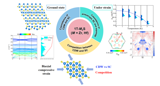 近期,该团队探索了新型MSene材料1T-M2S(M = Zr,Hf)中CDW、超导和非平庸拓扑序的关系。一方面,这类材料中可以实现2 × 2 CDW基态和超导的共存,室温下非谐效应可以消除CDW。另一方面,在双轴压缩应变下,Zr2S和Hf2S中分别发现了CDW和超导之间弱和强竞争相互作用,同时也具有超导和非平庸拓扑性质的共存。通过求解各向异性Eliashberg方程,证明了应变下的Zr2S和Hf2S是各向异性单能隙超导体。这项研究发现为理解CDW和超导之间的复杂相互作用以及二维材料中奇异量子态的相互作用提供了宝贵的视角。