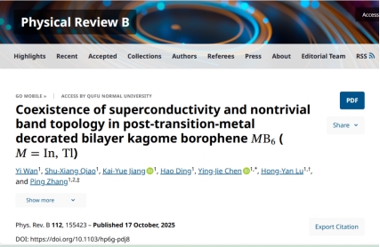 IIIA族金属In、Tl沉积的双层Kagome硼烯研究结果以“Coexistence of superconductivity and nontrivial band topology in post-transition-metal decorated bilayer kagome borophene MB6 (M = In, Tl)”为题,发表于物理学国际著名期刊Phys. Rev. B(自然指数期刊)。团队硕士研究生万一为该论文的第一作者,陈英杰博士、路洪艳教授、张平教授为通讯作者。