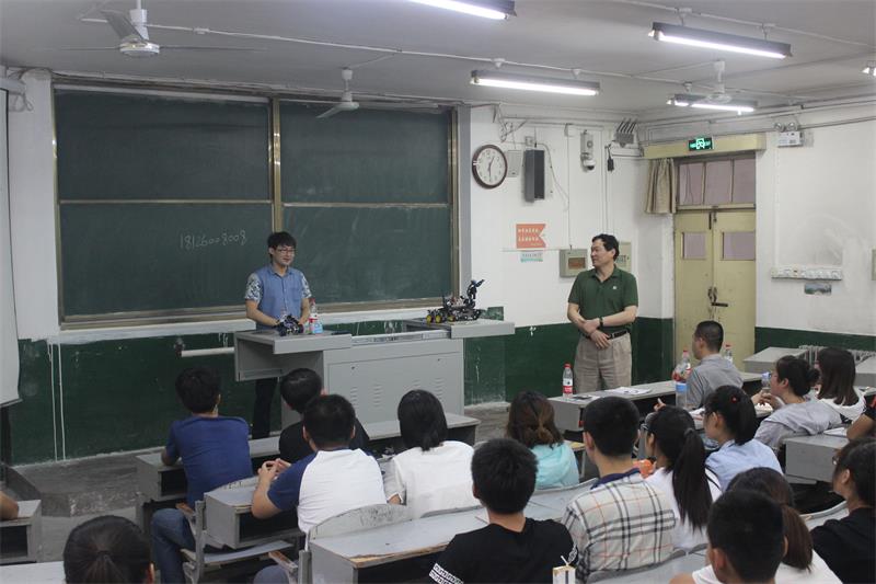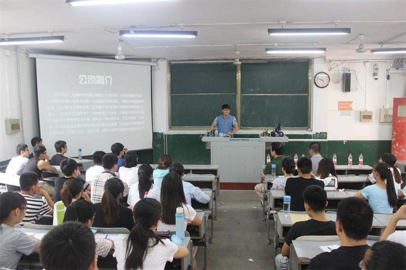 会议伊始,刘辉对深圳市小二极客科技有限公司以及自主研发的WiFi 无线技术和单片机技术的第一人称视频控制机器人、智能车等做了简单介绍和成果展示。随后,他讲述了近四年的创业历程,并且总结了创业中的经验,希望同学们能选择正确的发展方向和志同道合的合作伙伴,他还就大学生活向在座同学提出中肯建议,并对同学们提出的问题一一给予解答。最后,秦文华发表讲话,他表示大学生应当充分利用好大学时光,努力培养发展自己的兴趣爱好,充实丰富大学生活。