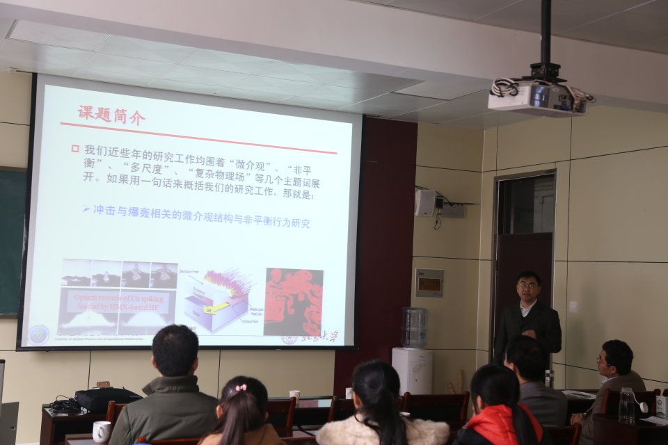 报告中,许爱国研究员综述了离散玻尔兹曼方法的由来、发展和最新研究现状,介绍了这种方法在研究冲击与爆轰等微介观系统非平衡多尺度复杂过程的应用,展示了其描述复杂流体系统非平衡物理效应的强大能力,并介绍了他们小组在发展离散玻尔兹曼方法方面的新思路和最新成果。林传栋博士以二维燃烧系统为例详细介绍了离散玻尔兹曼方法在燃烧系统中的应用,展示了多种条件下燃烧系统随时空演化的规律。报告结束后,许爱国研究员和林传栋博士与老师和同学们进行了深入的交流和讨论。
