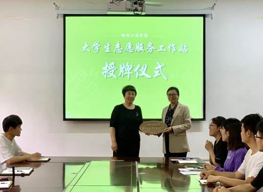 大学生志愿服务工作站授牌,由学院团委书记、工作室主持人王琼接受授牌。