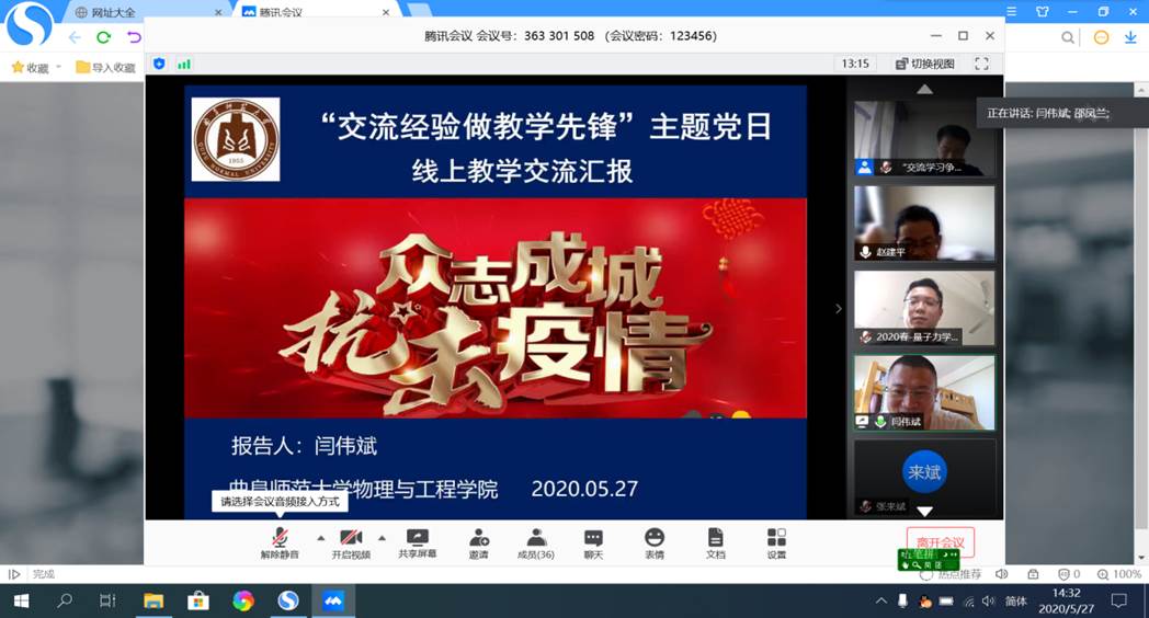 为贯彻落实教育部、省教育厅和学校疫情防控期间“停课不停教不停学”的要求,进一步发挥基层党组织的战斗堡垒作用和广大党员的先锋模范作用,5月27日下午,学院教工第一、二党支部通过腾讯视频会议联合开展“交流经验 做教学先锋”主题党日活动。活动由教工第二党支部书记王玉德同志主持。