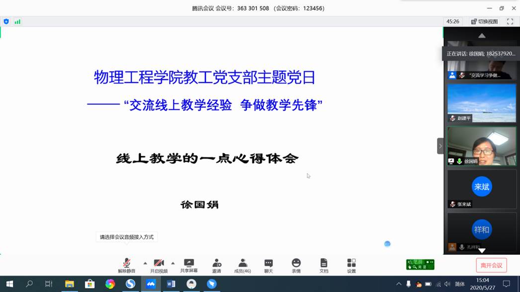 学院线上直播教学中表现优秀的闫伟斌老师和徐国娟老师,结合自己所教课程,从教学平台的筛选、教学用具选择和准备、教学课件的设计、教学过程的师生互动、辅导答疑、课堂思政等环节向与会党员介绍了线上教学经验。两位老师的经验分享使大家得到了很大启发。