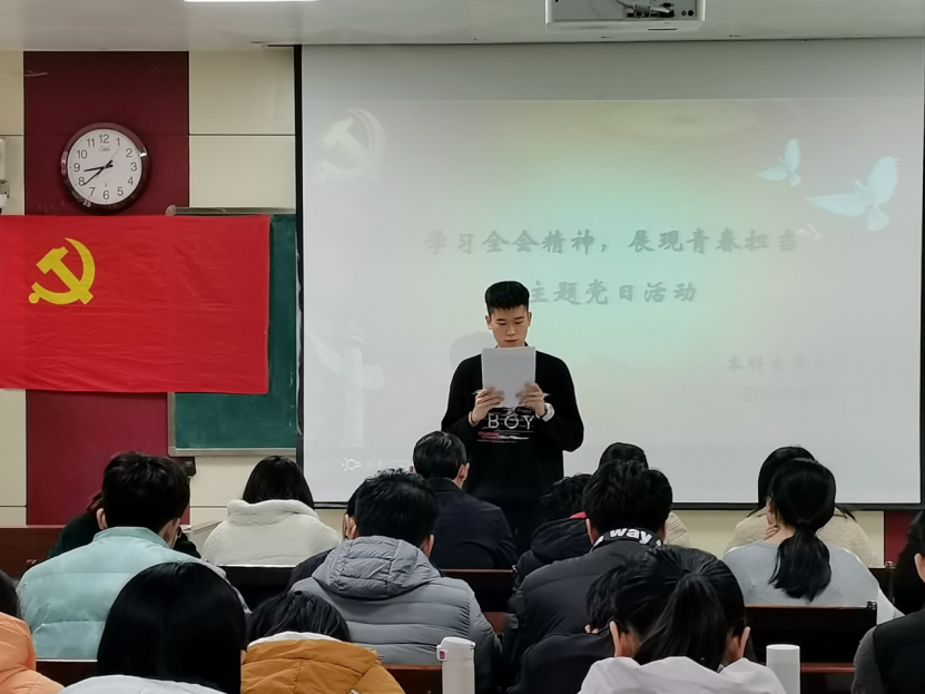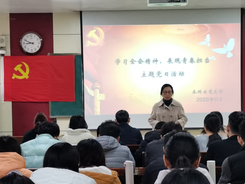 活动伊始,颜冲对中国共产党第十九届中央委员会第五次全体会议背景等内容进行介绍。全体与会党员在戴润洲同志的带领下共同学习了第十九届五中全会会议公报。随后,与会党员纷纷发言,围绕十九届五中全会内容并结合自身实际分享感悟体会。活动最后,王琼进行总结,强调本科生党支部接下来的工作重点是让党员身份亮起来、让党员管理严起来、不断创新党员教育活动形式,希望全体党员以党支部入选学校党建工作样板支部为契机,进一步加强自身学习,为党支部建设规范提升工作贡献力量。