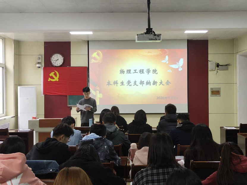 11月5日上午,学院本科生党支部于物理楼313会议室召开纳新大会。本科生党支部书记王琼,辅导员李爱国、颜冲、邱金芝、孔瑞、王衡出席会议,本科生党支部全体党员及发展对象参加。本次会议由组织委员颜冲主持。