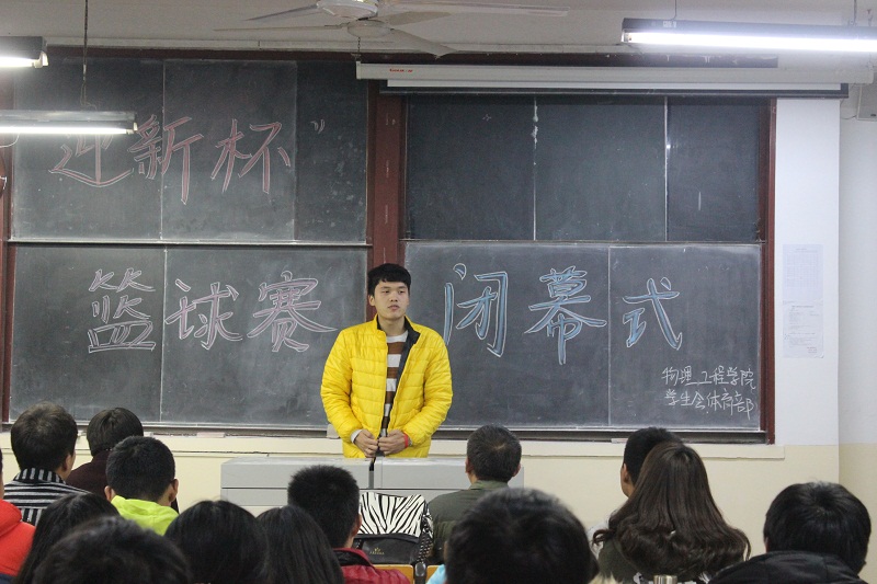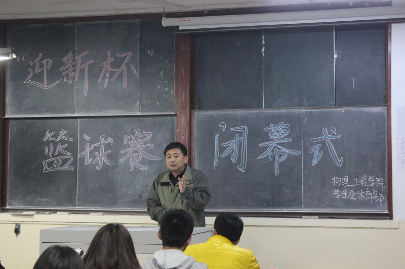 “迎新杯”篮球赛闭幕式在院楼210教室举行。学院党总支副书记孙金杰、学生会副主席李永超、体育部成员、篮球教练、篮球赛裁判员、获奖队员参加了本次闭幕式。