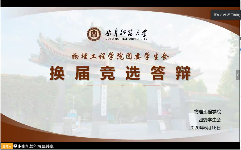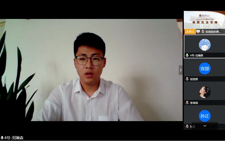 利用腾讯会议线上召开第四十届团委学生会换届竞选大会。团委书记王琼、辅导员李爱国、颜冲、李靖靖出席会议,第39届团委学生会主席团参加会议。本次会议由团委副书记兼学生会副主席王文君主持。