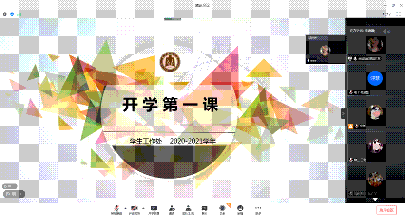 利用腾讯会议组织开展2020-2021学年“开学第一课”主题班会。辅导员李爱国、颜冲、李靖靖分别主持班会,全体同学参加。