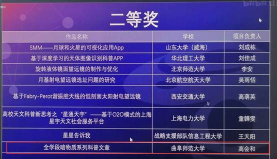 在学院杨玉鹏老师的指导下,由2017级物理学专业高会和、2020级光电信息科学与工程专业王家骏、物理学(师范M)专业翟夏宁、物理学专业代成蕊和努尔比亚·努尔艾力组成的代表队参加比赛并成功晋级决赛。经过评选,他们创作的科普作品《全学段暗物质系列科普文章》荣获二等奖。