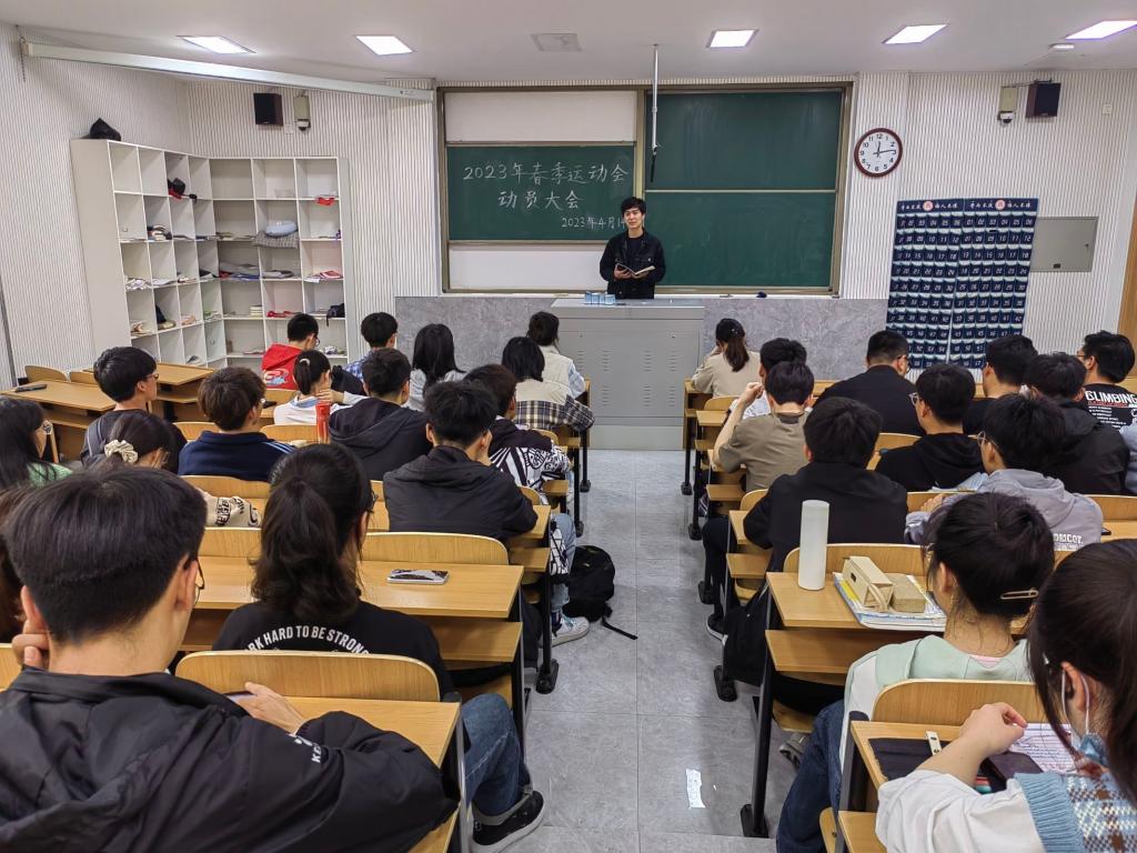 学生的良好精神风貌。张杰详细讲解了春季运动会的比赛项目、赛程机制,以及运动会训练期间的流程安排。运动员代表张永函表示要发扬为集体荣誉而奋战的运动精神,并郑重承诺将服从裁判判罚,遵守规则,尊重对手,展现学院运动员风采。教练员朱成林鼓励参赛运动员们运动会上充分发扬“不怕苦”的精神,锐意拼搏、团结协作,取得满意成绩。