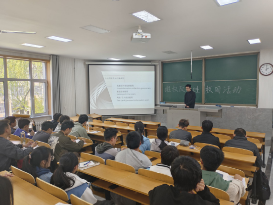 活动过程中,史永鹏通过PPT向同学们介绍了反诈骗知识,结合相关案例讲解维权反诈的校园背景;他重点讲解维权方法,强调用法律武器维护自身合法权益,介绍维权反诈的重大意义,说明维权反诈是维护自身合法权益的必要手段,也是建设公平社会的必要要素。活动最后,史永鹏向在场同学发起号召,呼吁在场同学理智判断,提高自我保护意识,坚决维护自身财产安全。
