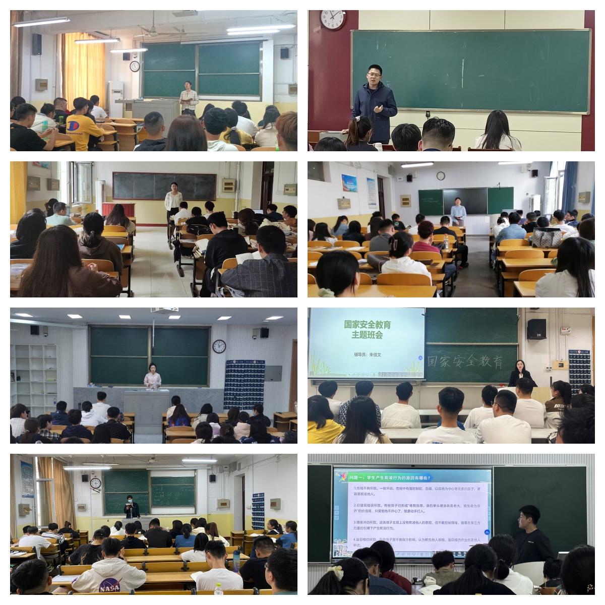 各年级辅导员结合当前国家安全形势,讲解了国家安全的内涵和重要性,通过分析近年来发生的与国家安全相关的典型案例,引导学生深入思考国家安全与个人行为的关系。辅导员老师通过宣讲国家安全相关教育材料,为同学们普及《中华人民共和国国家安全法》、《中华人民共和国保守国家秘密法》等相关法律法规,提高识别和防范安全风险的能力。此外,毕业班辅导员还讲解了大学生参军入伍的相关政策,鼓励更多优秀青年学子到部队中成长和锻炼自己。