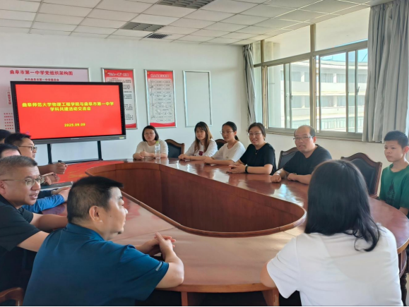 党委副书记王琼、物理教学论教研室主任张旭带队前往曲阜市第一中学。曲阜市第一中学副校长张会文、教务处主任张广对学院一行的到来表示热烈欢迎,并全程参与交流。