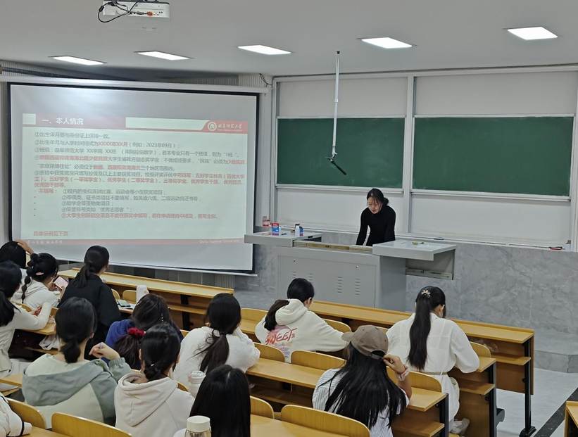 会议中,学生会权益部负责人向获奖同学表示祝贺,并申明规范填报材料的重要性。她围绕相关申请材料逐项系统讲解,明确填写的时间节点与基本规范,强调信息务必真实完整,严禁不实填报;同时,针对常见错漏环节重点提示,详细阐释申请理由、获奖情况的撰写要求。负责人结合往年审核中的典型案例,深入剖析,助力同学们明晰标准、规避误区。