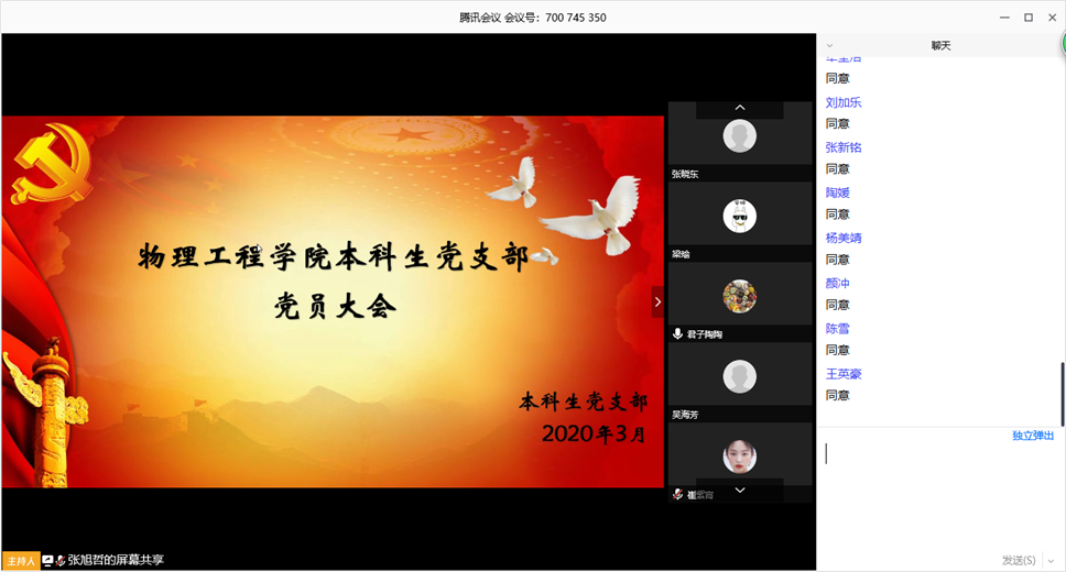 为了更好开展本科生党支部工作,经学院党委批示,3月29日上午,学院本科生党支部以线上会议形式召开本科生党支部党员大会,进行本科生党支部委员会增补选举工作。本科生党支部书记王琼,辅导员李爱国、颜冲、李靖靖出席会议,本科生党支部党员参加会议。会议由李靖靖同志主持。