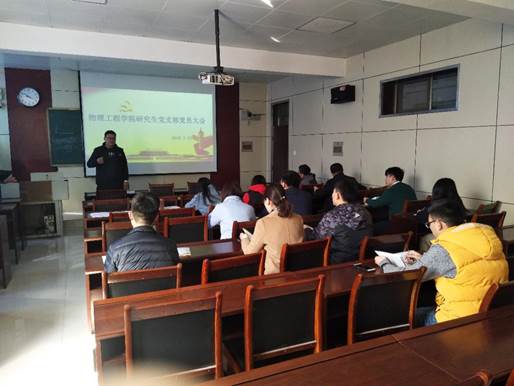为深入学习贯彻习近平新时代中国特色社会主义思想和党的十九大精神,推进“两学一做”学习教育常态化制度化,提升基层党组织组织力,严格党员教育管理监督,3月13日上午,学院研究生党支部在物理楼313教室召开全体党员大会,落实学校关于召开组织生活会并开展民主评议党员工作的要求。党支部邀请了王海龙副院长参加了本次会议,会场气氛温馨有序、严肃而有教育意义。