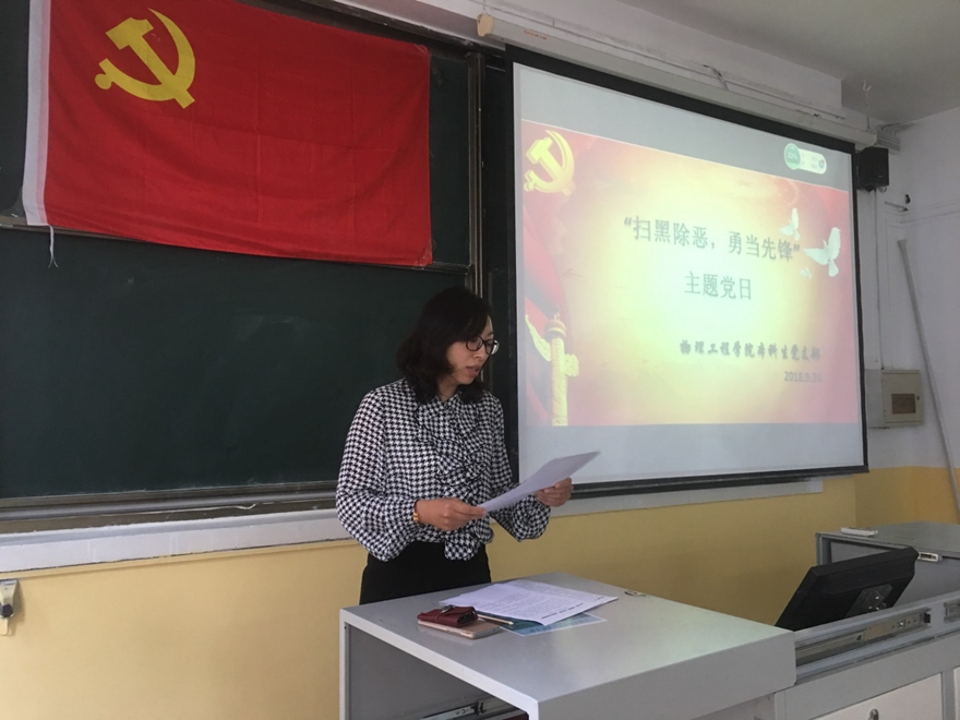 本科生党支部在院楼210教室开展“扫黑除恶、勇当先锋”主题党日活动。党支部书记王琼主持本次活动。