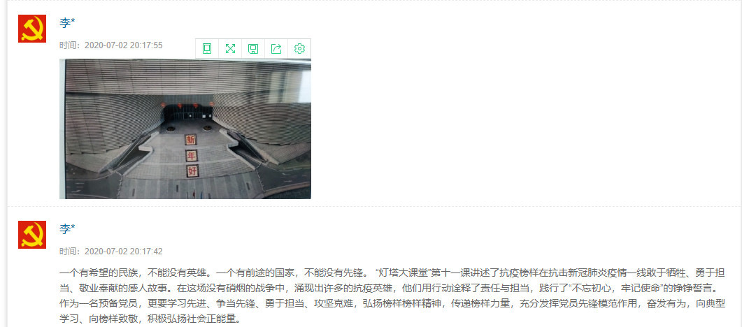 7月1日,支部党员按照要求观看了“灯塔大课堂”第十一课《榜样讲党课》。观看节目后,全体党员通过山东e支部互动交流模板进行线上交流,他们纷纷表示要始终做到不忘初心、牢记使命,见贤思齐,奋发有为,充分发挥好党员先锋模范作用,向典型学习,向榜样致敬。在学思践悟中坚定理想信念,在奋发有为中践行初心使命,弘扬社会正能量。