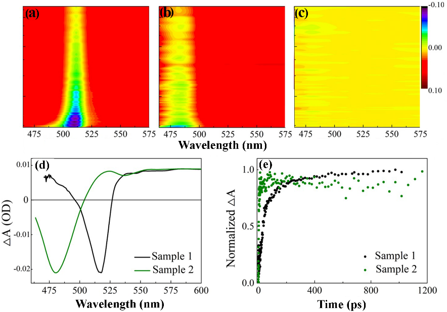 量子点(QD)是典型的低维物理体系,具有显著的尺寸依赖量子限域效应。钙钛矿量子点在光致发光量子产率(PLQY)和颜色纯度方面具有显著优势,以量子点照明和显示为代表的光电子器件(如QLED和QDTV)应用前景巨大。硕士研究生徐帆通过控制生长温度,获得了具有尺寸和带隙可调的CsPbBr3发光量子点,利用稳态荧光和飞秒瞬态超快光谱清晰展示了CsPbBr3量子点的量子尺寸效应和热声子瓶颈效应,并详细讨论了热载流子的冷却动力学过程,相关结果发表在J Alloy. Compd. (DOI: 10.1016/j.jallcom.2020.154834, 2020)。博士生孔晓波通过改变合成程中添加配体 (AMPS)的浓度,也实现了钙钛矿量子点大小控制。但随着配体电负性的增加,观察到了与传统量子尺寸限制效应相反的PL蓝移现象,通过超快光谱与能带理论计算模拟,揭示了该量子点反常量子限域效应的物理机制,相关结果发表在Appl. Phys. Lett. (DOI: 10.1063/1.5116258, 2019)。为进一步提高量子点发光效率,研究生隽方蓥制备了金纳米棒/ CsPbBr3量子点复合薄膜,利用金属/半导体界面的等离子体共振耦合效应,实现了光致发光增强,讨论了贵金属纳米结构LSPR增强量子点发光性能的物理机制,相关结果发表在Chem. Phys. (DOI:10.1016/ j.chemphys. 2019.110627, 2020)。尽管该类量子点具有丰富的量子物理效应和巨大的应用潜力,材料稳定性是阻止其实际应用最具挑战性的障碍之一。通过与浙江大学杨世宽教授等人合作,揭示了超稳定的卤羟铅矿Pb(OH)Br可以将钙钛矿QD包覆,从而自发形成QD@Pb(OH)Br核壳结构。通过改变引入反应溶液中的CsBr的量,可以精确地控制QD中钙钛矿层数。QD@Pb(OH)Br核壳微粒在不同光激发下显示出不同的颜色,相关论文发表在Nano Lett (DOI:10.1021/acs.nanolett.9b04730, 2020)。
