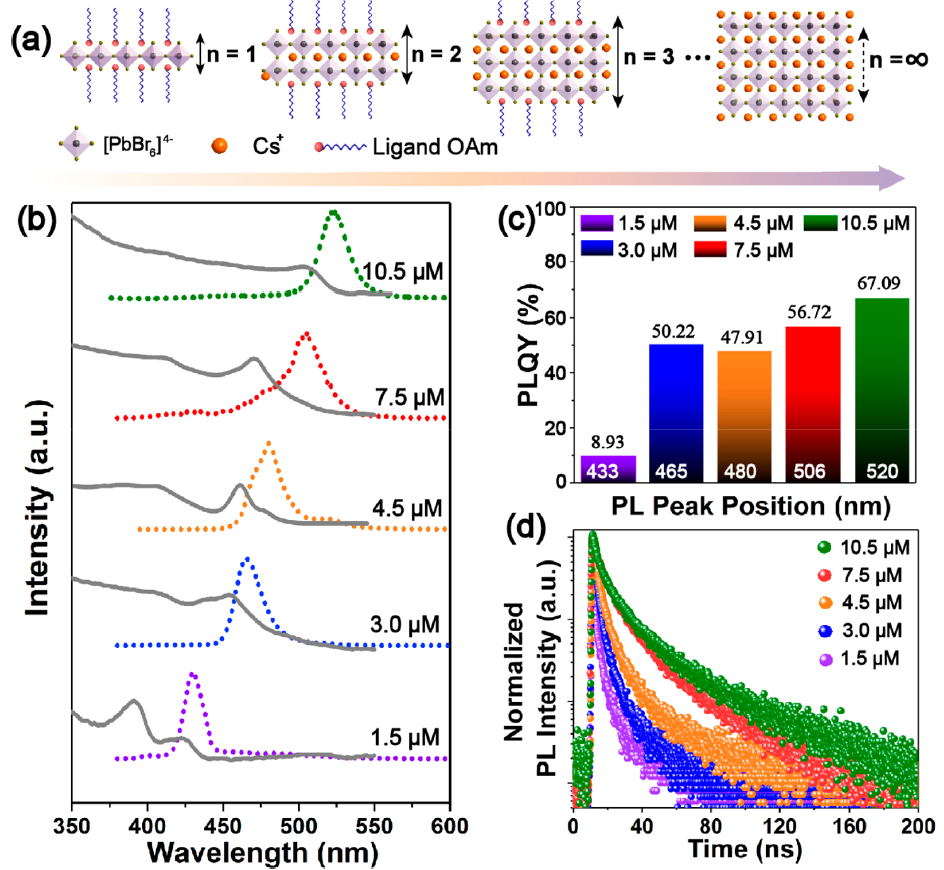 图3 卤化物钙钛矿量子点典型形貌图(上)和稳态(中)、瞬态(下)荧光光谱。