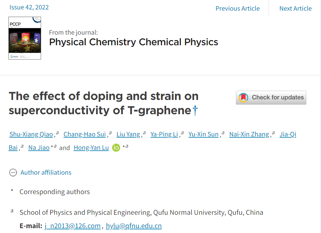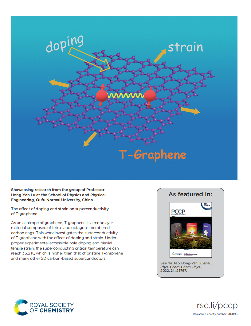 2019级物理学专业本科生乔树祥同学以第一作者撰写的论文“The effect of doping and strain on superconductivity of T-graphene”在英国皇家化学学会旗下Top期刊Physical Chemistry Chemical Physics(PCCP)(影响因子3.945,JCR分区SCI二区Top)上发表,并被出版社遴选为封面论文。隋长昊、杨柳、李牙平、孙雨欣、张乃鑫、白佳琪同学参与了本研究。91热爆