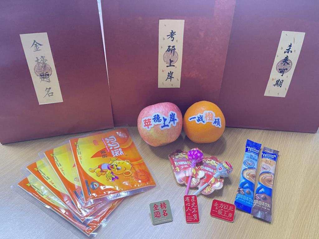 此次“加油包”是学院为考研学子定制的一份特别的礼物。红色的袋子象征着吉祥、喜庆、斗志,“考研上岸”“金榜题名”“未来可期”三个标签代表着学院对考研学生的美好祝愿;内含苹果、橙子、暖贴、咖啡、糖果、励志徽章,寓意“苹”稳上岸、一战“橙”硕。另外,学院提前绘制了考研祝福征集板,并将低年级同学的手写祝福贴纸放进“加油包”,“终会上岸,阳光万里”“守得云开见月明”......字里行间给予考研学生温暖及鼓励。