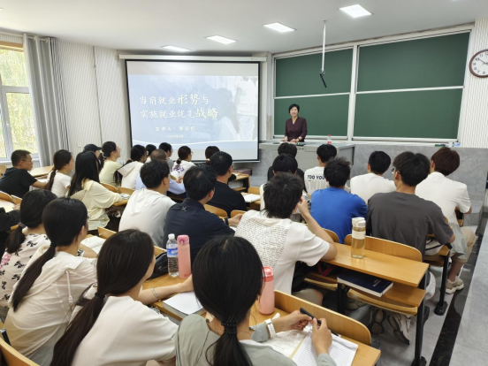 李志红围绕就业形势总体稳定、就业压力仍存、确保就业优先、着力拓宽渠道四个方面进行交流互动式授课,深入剖析了当前我国就业形势和国家实施就业优先战略,讲解当代大学生就业相关政策。她从学生现实关切出发,结合学院近年来在就业工作中的成功案例,详细介绍了专业发展的就业路径及行业用人需求等,同时勉励同学们根据自身特长及专业,从实际出发发现个人兴趣,全面评估个人技能、知识和沟通能力,合理利用学校资源,把握就业机会,积极适应就业形势的变化,认真学习专业知识与技能,以真才实干不断贴合行业用人需求,为将来实现高质量就业做好充分准备,让个体奋斗与强国征程同频共振。